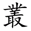 【唐韻】【正韻】徂紅切【集韻】【韻會】徂聰切,𠀤族平聲。【說文】聚也。从丵从取。【書·無逸】是叢于厥身。又姓。南北朝滁州刺史叢鐇。又臺名。在邯鄲。又【集韻】或作樷。【前漢·東方朔傳】樷珍怪。又作藂。【前漢·息夫躬傳】藂棘棧棧。【註】詩葛覃註:灌木曰藂。又【韻補】叶徂黃切,音牀。【韓愈·此日足可惜詩】蕭條千萬里,會合安可逢。淮之水舒舒,楚山直叢叢。逢音房。【韻會】後人誤作菆,或作蕞,二字皆非。毛氏曰:丵,上从四直,兩長兩短。从丱,非。丵原刻下从羊。